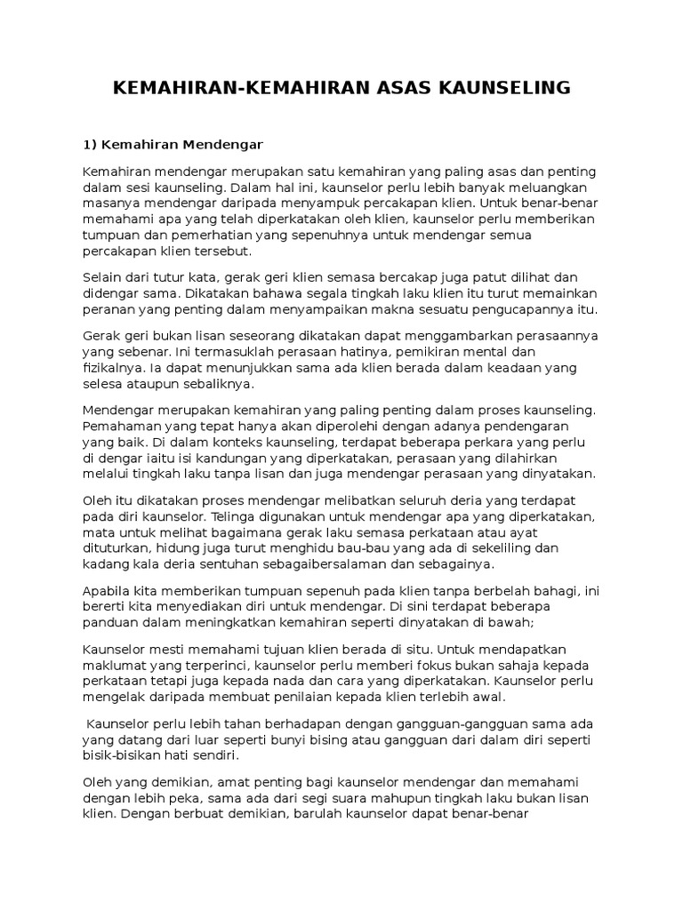 Kemahiran Asas Kaunseling dalam Kalangan Guru Kaunseling Sekolah Menengah. Kemahiran asas kaunseling dalam dunia kaunseling klien dan kaunselor merupakan unsur utama yang membentuk konsep dan proses kaunseling melalui bimbingan. Interested in flipbooks about KEMAHIRAN ASAS KAUNSELING KEMAHIRAN MENDENGAR DAN KEMAHIRAN MEMBERI RESPON.